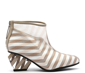 Ja*ckie Op Bo*otie - это ботильон на среднем каблуке, выполненный из неопрена с цифровым принтом и многослойный из ткани с двухцветной сеткой. Вибрирующий узор перекликается с ограненным акриловым каблуком.