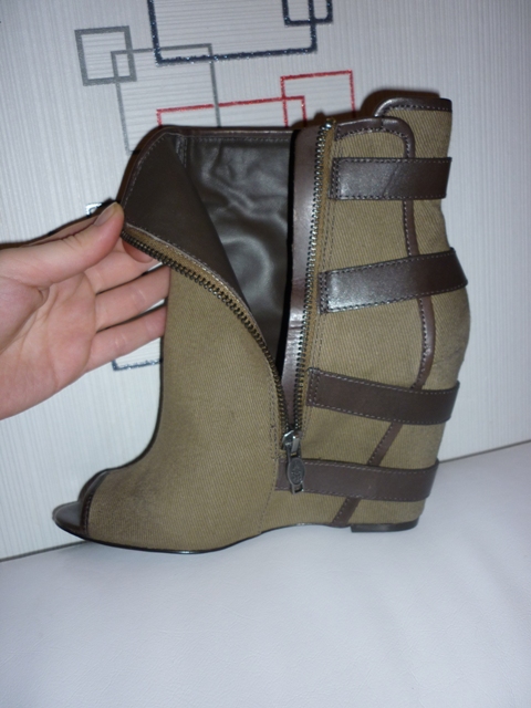 По стельке 39 - 25,5 см. Высота скалы 10 см. Внутри кожа, снаружи - текстиль цвета хаки. Отделка и ремешки темно-коричневые. Ремешки декоративные, на внутренней стороне молния/