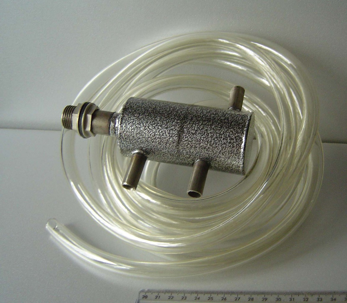 Емкость (скороварку) необходимо приобрести с плоской крышкой, чтобы установленный на ней аппарат стоял вертикально. На отводы аппарата, закрепленного на емкости, наденьте шланги для охлаждения водой и для выхода дистиллята.